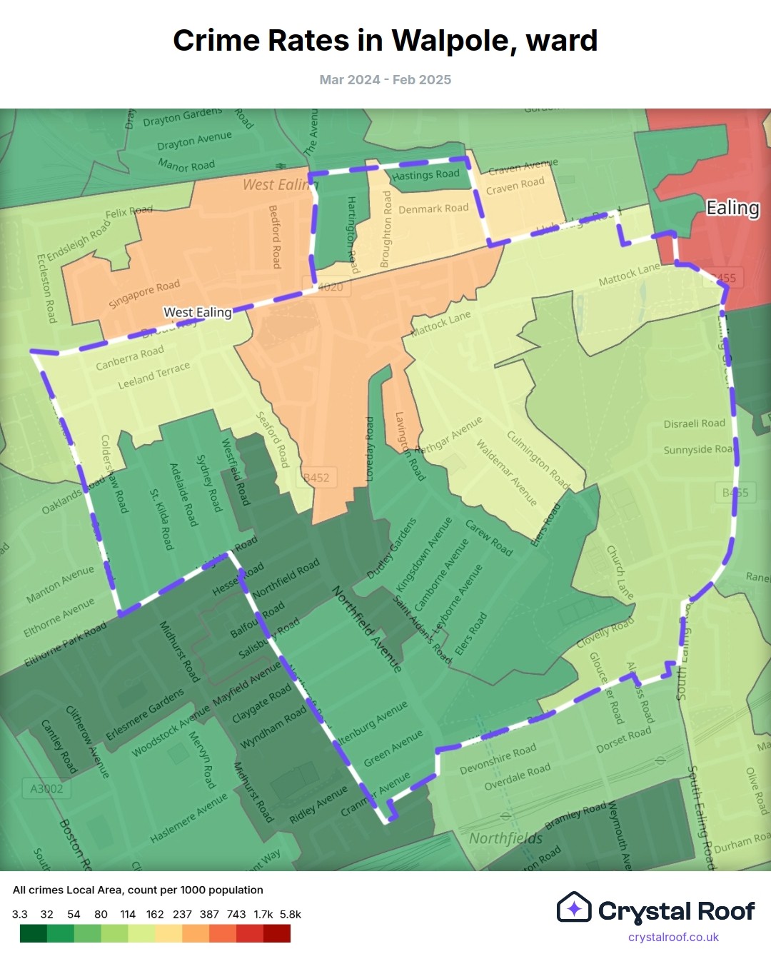 Walpole (ward) is located within Ealing (borough). Annual total crime rate in Ealing (borough) is 117 crimes per thousand resident population, which can be rated as 6 out of 10 or medium crime level compared to other local authority districts in England and Wales.