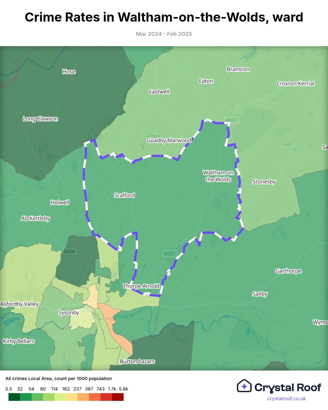 Waltham-on-the-Wolds, (ward) includes areas with the following crime ratings (see map):