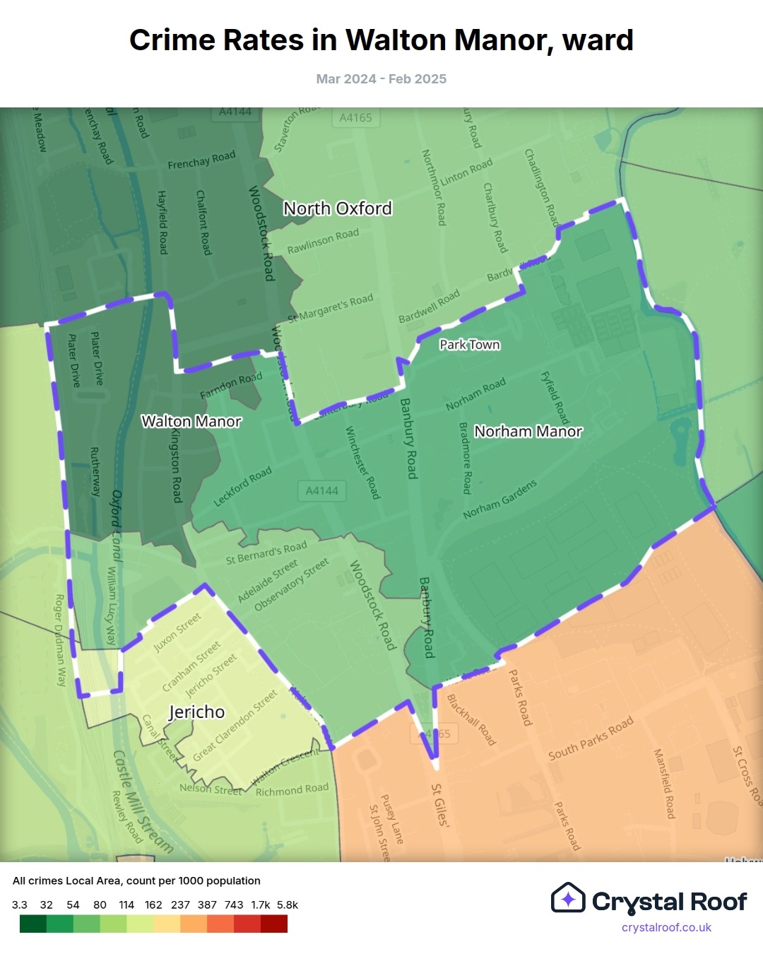 Walton Manor (ward) is located within Oxford (borough). Annual total crime rate in Oxford (borough) is 112 crimes per thousand resident population, which can be rated as 5 out of 10 or medium crime level compared to other local authority districts in England and Wales.