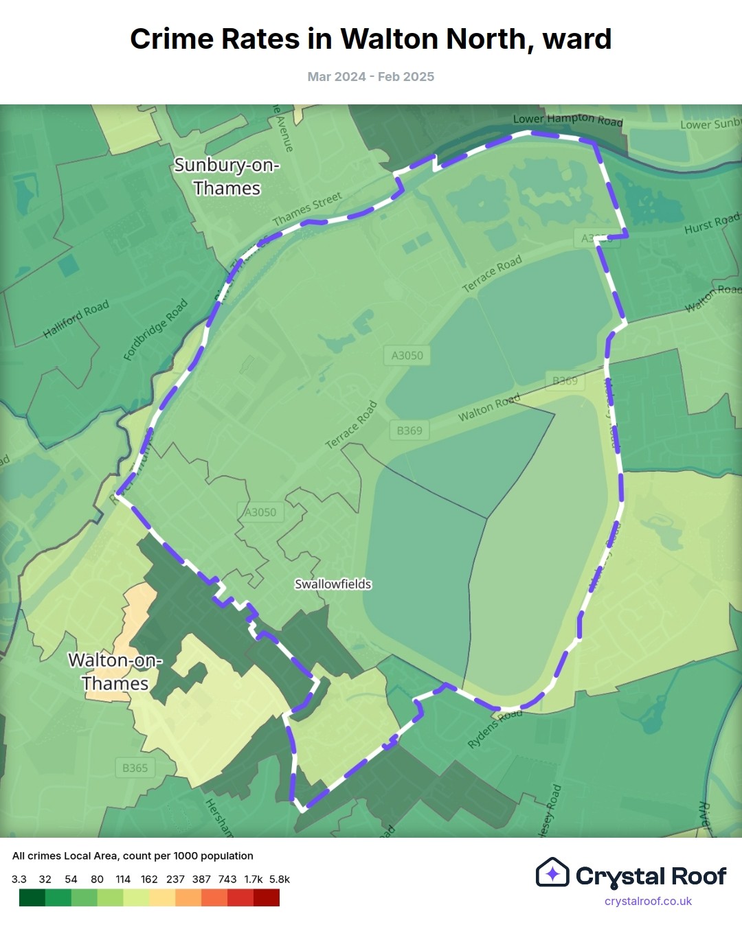 Walton North (ward) is located within Elmbridge (borough). Annual total crime rate in Elmbridge (borough) is 60.7 crimes per thousand resident population, which can be rated as 2 out of 10 or low crime level compared to other local authority districts in England and Wales.