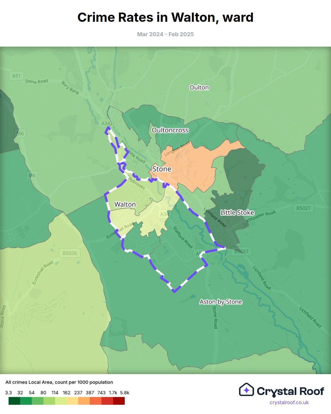 Walton (ward) is located within Stafford (borough). Annual total crime rate in Stafford (borough) is 74.9 crimes per thousand resident population, which can be rated as 3 out of 10 or low crime level compared to other local authority districts in England and Wales.