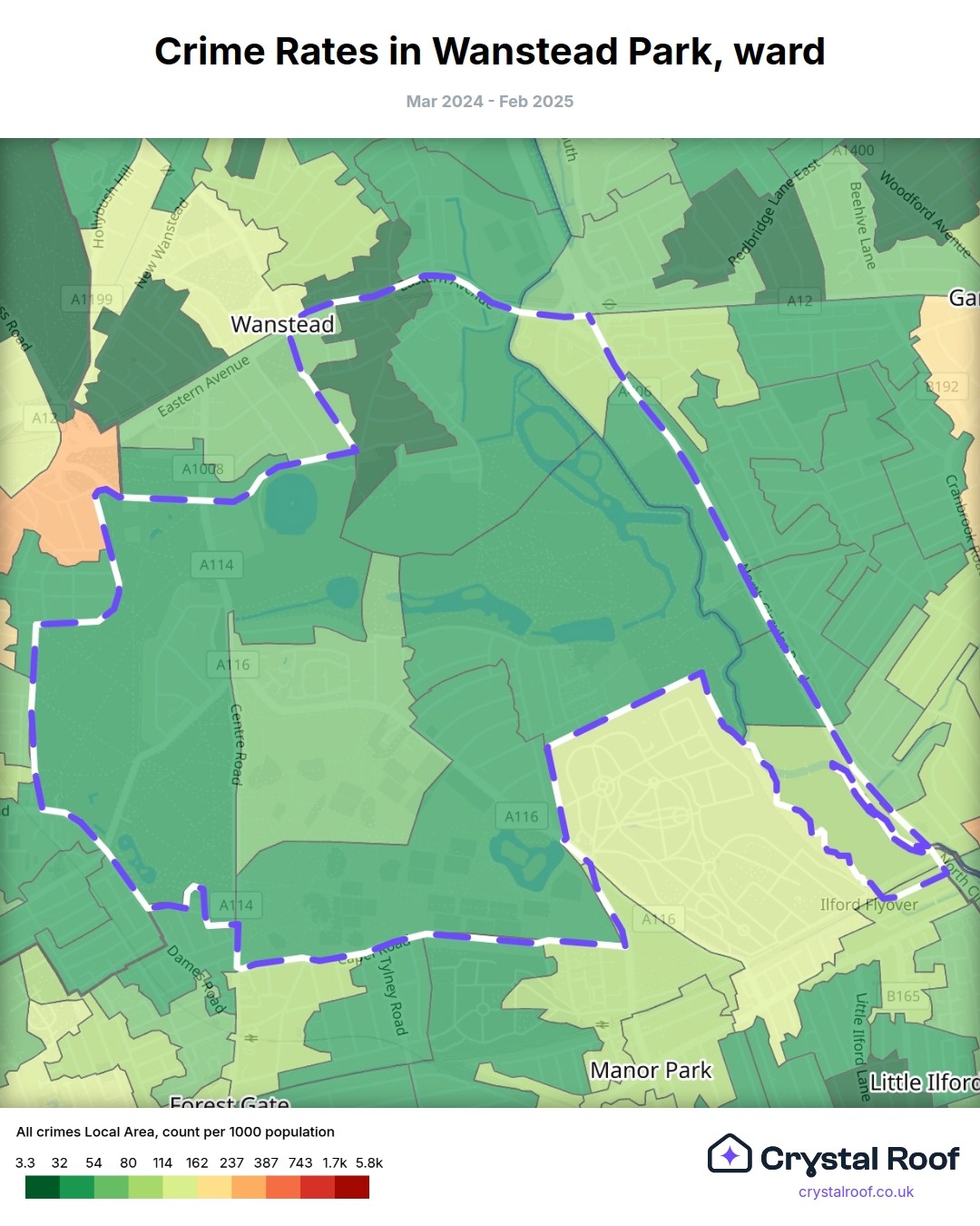 Wanstead Park, (ward) includes areas with the following crime ratings (see map):
