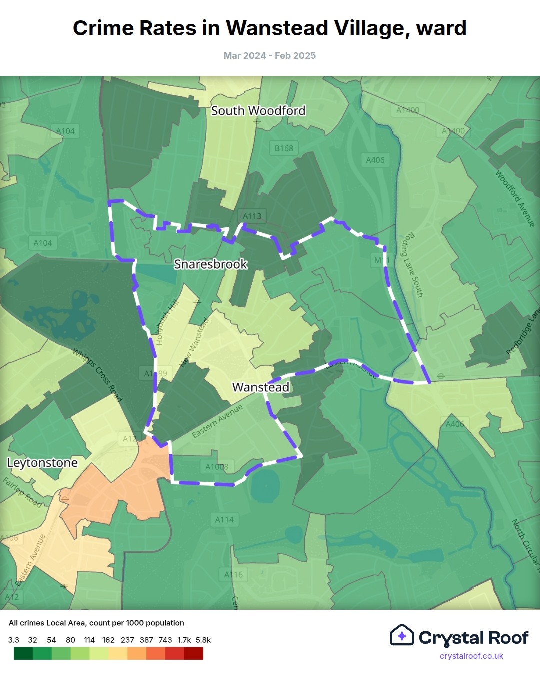 Wanstead Village, (ward) includes areas with the following crime ratings (see map):