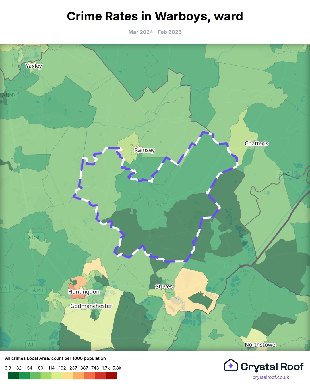 Warboys, (ward) includes areas with the following crime ratings (see map):