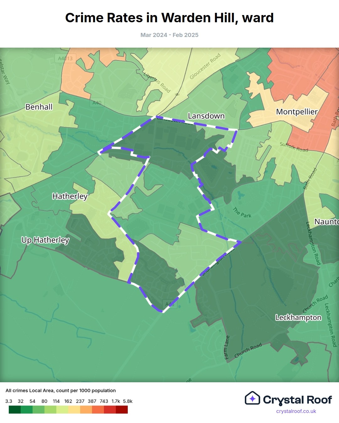 Warden Hill (ward) is located within Cheltenham (borough). Annual total crime rate in Cheltenham (borough) is 107 crimes per thousand resident population, which can be rated as 5 out of 10 or medium crime level compared to other local authority districts in England and Wales.