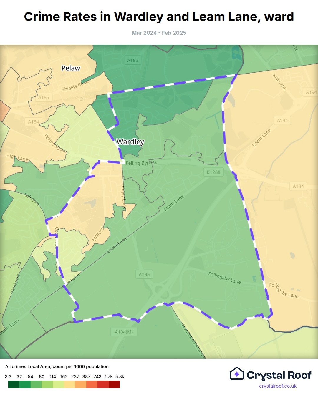 Wardley and Leam Lane, (ward) includes areas with the following crime ratings (see map):