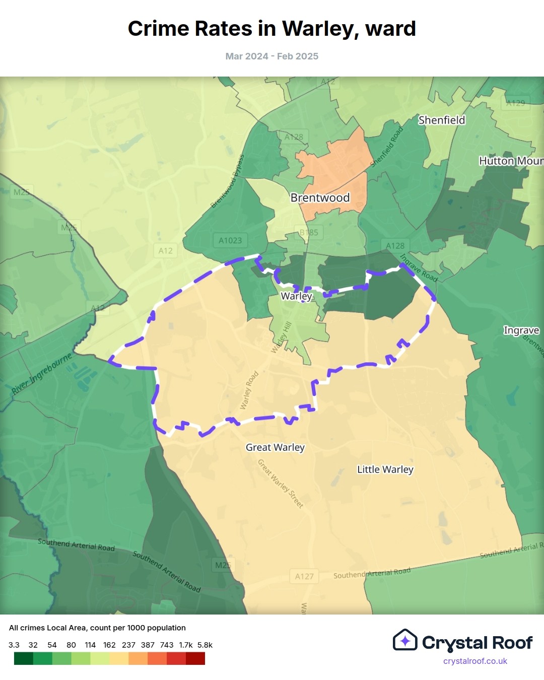 Warley (ward) is located within Brentwood (borough). Annual total crime rate in Brentwood (borough) is 75 crimes per thousand resident population, which can be rated as 3 out of 10 or low crime level compared to other local authority districts in England and Wales.