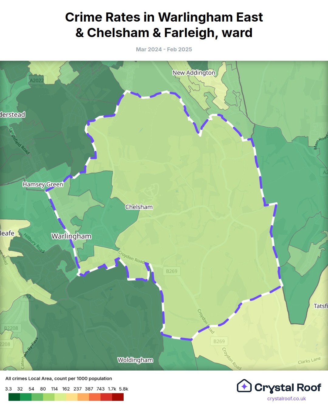 Warlingham East & Chelsham & Farleigh, (ward) includes areas with the following crime ratings (see map):