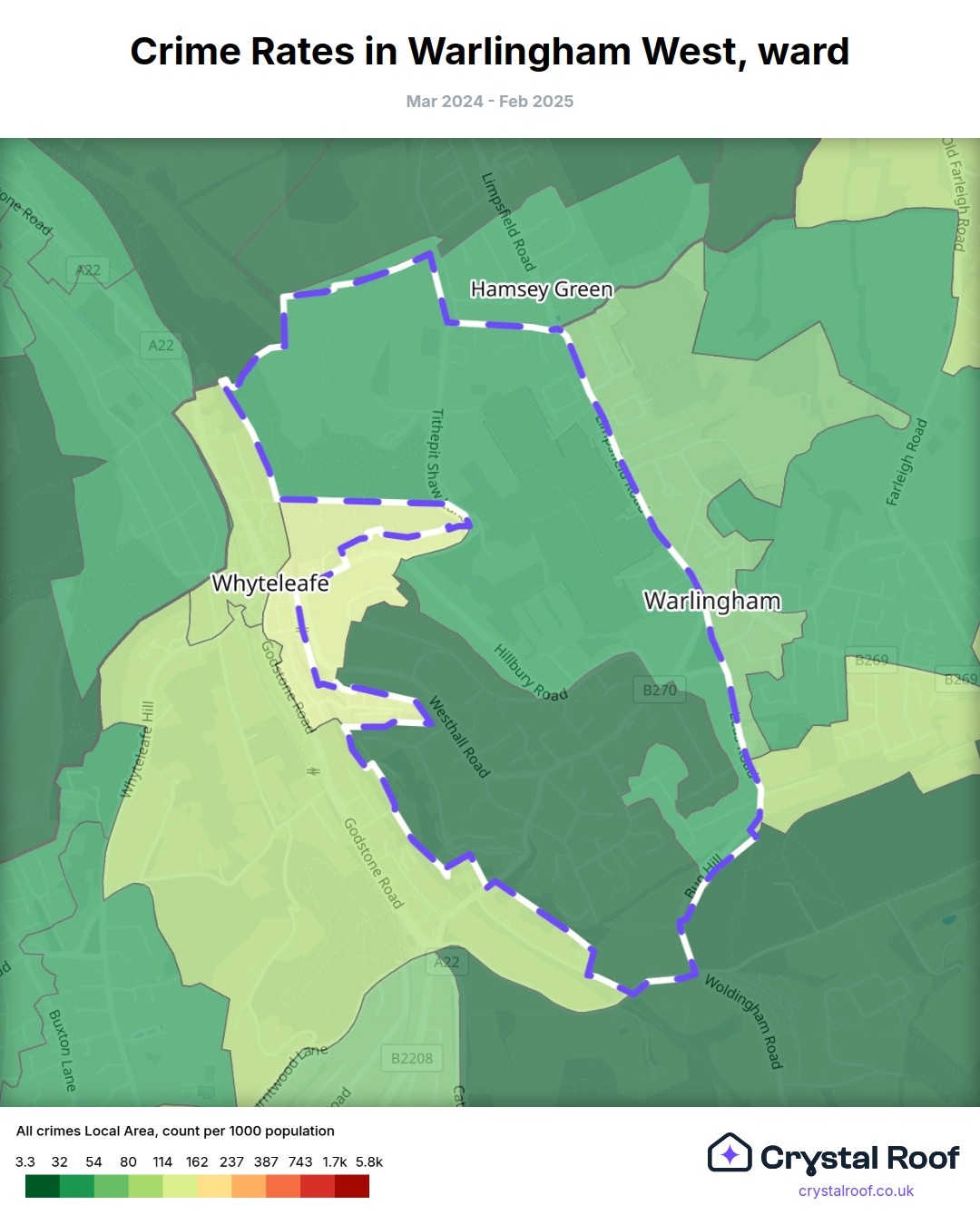 The figures in grey indicate the relative ratings of Warlingham West (ward) for a specific crime type compared to other wards in England and Wales.