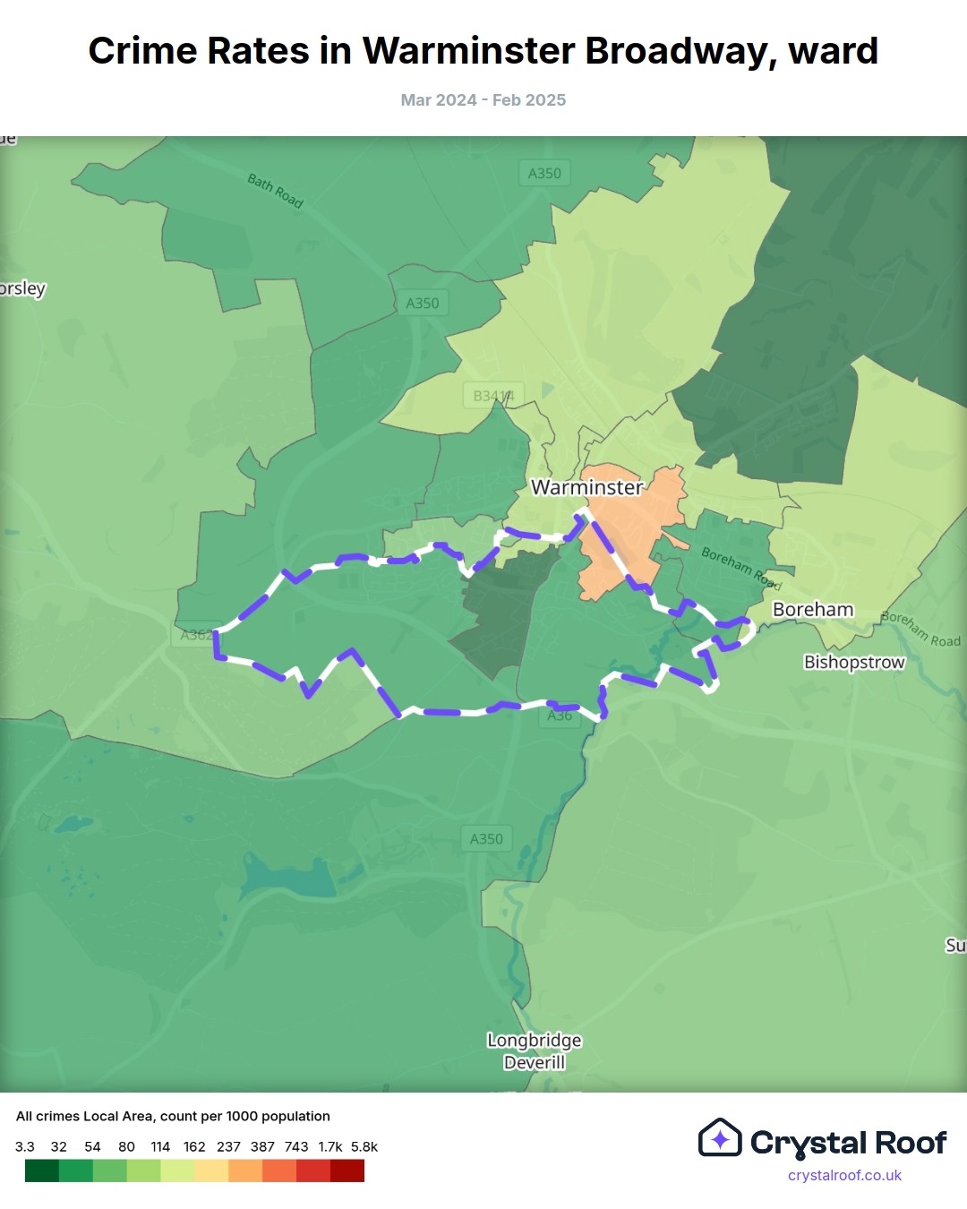 Warminster Broadway, (ward) includes areas with the following crime ratings (see map):