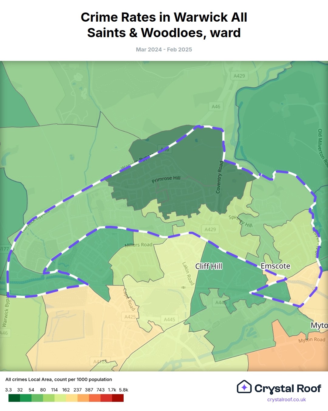 Warwick All Saints & Woodloes, (ward) includes areas with the following crime ratings (see map):
