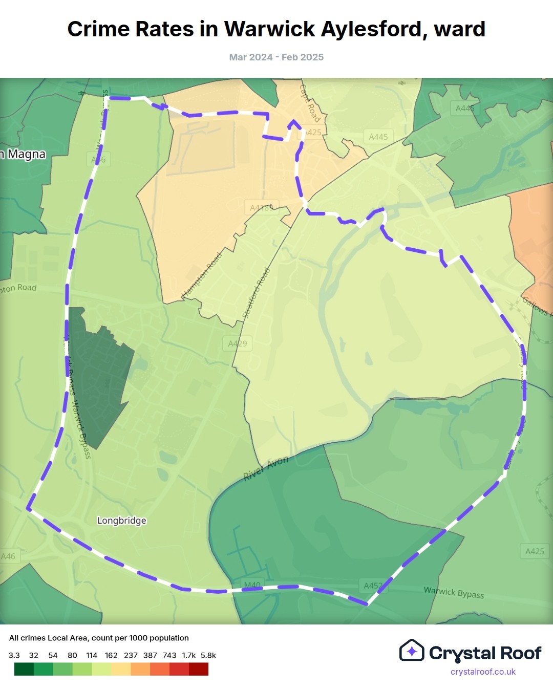 Warwick Aylesford, (ward) includes areas with the following crime ratings (see map):