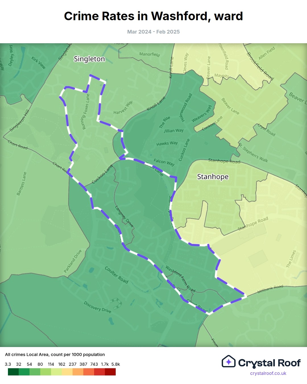 Washford (ward) is located within Ashford (borough). Annual total crime rate in Ashford (borough) is 82.8 crimes per thousand resident population, which can be rated as 3 out of 10 or low crime level compared to other local authority districts in England and Wales.