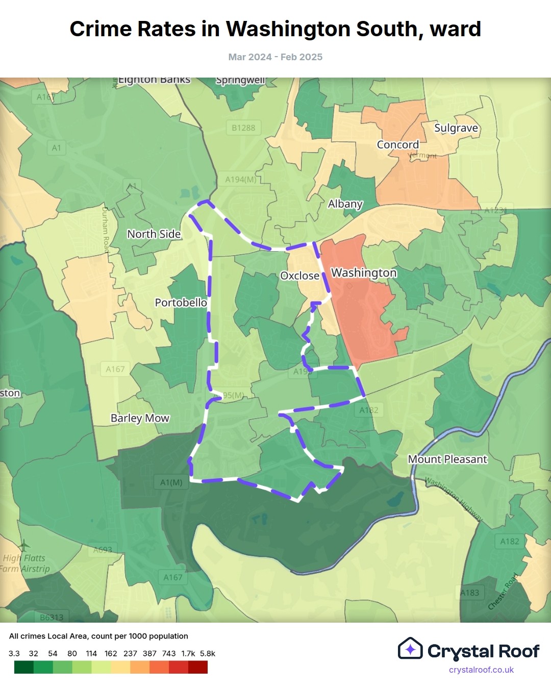 Washington South (ward) is located within Sunderland (borough). Annual total crime rate in Sunderland (borough) is 122 crimes per thousand resident population, which can be rated as 6 out of 10 or medium crime level compared to other local authority districts in England and Wales.