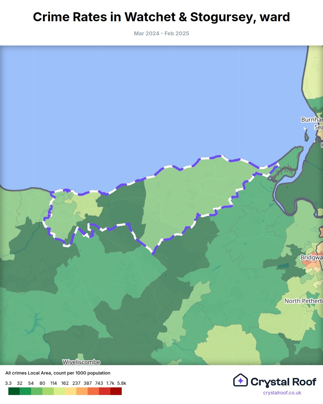 The figures in grey indicate the relative ratings of Watchet & Stogursey (ward) for a specific crime type compared to other wards in England and Wales.