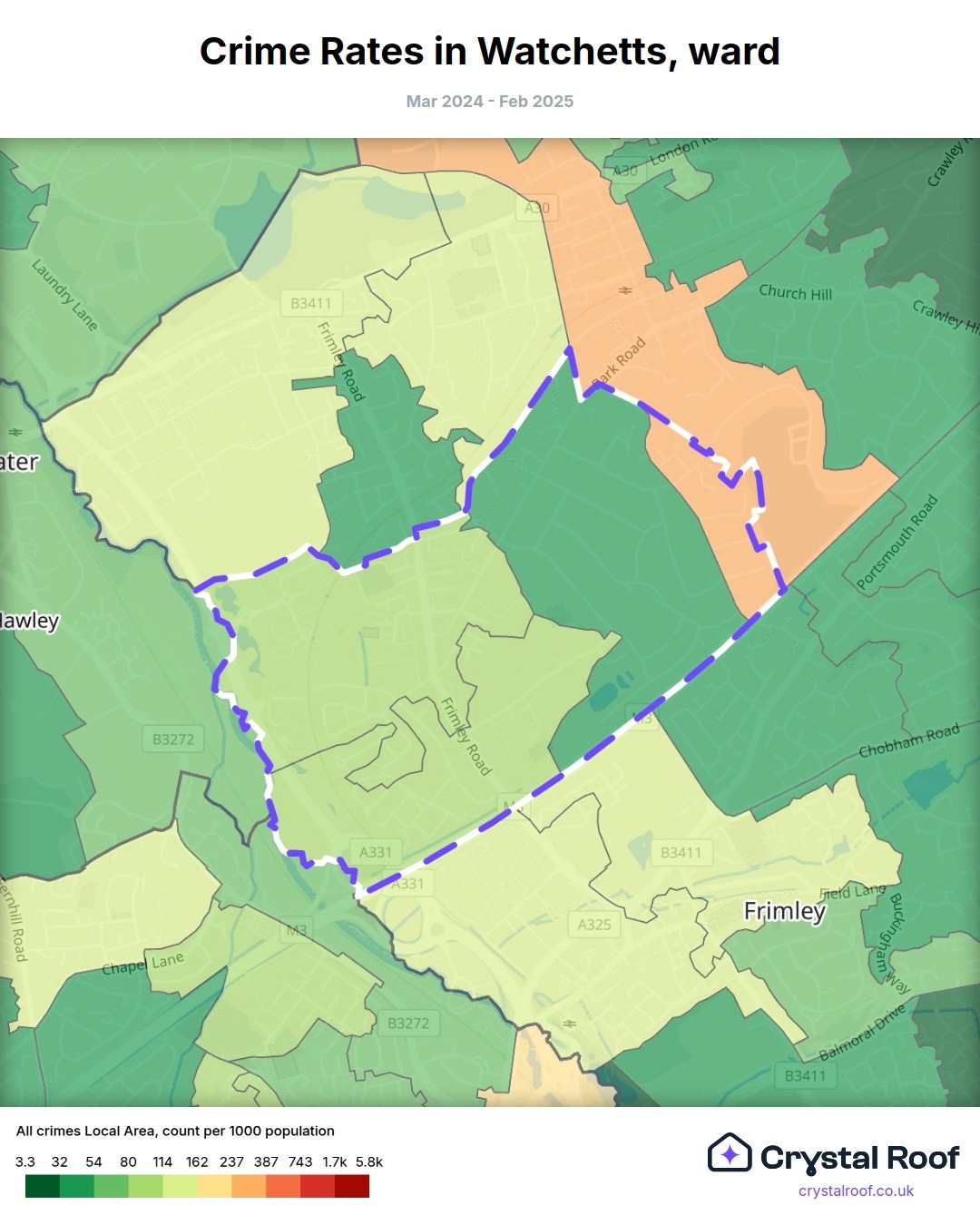 Watchetts (ward) is located within Surrey Heath (borough). Annual total crime rate in Surrey Heath (borough) is 65.5 crimes per thousand resident population, which can be rated as 2 out of 10 or low crime level compared to other local authority districts in England and Wales.