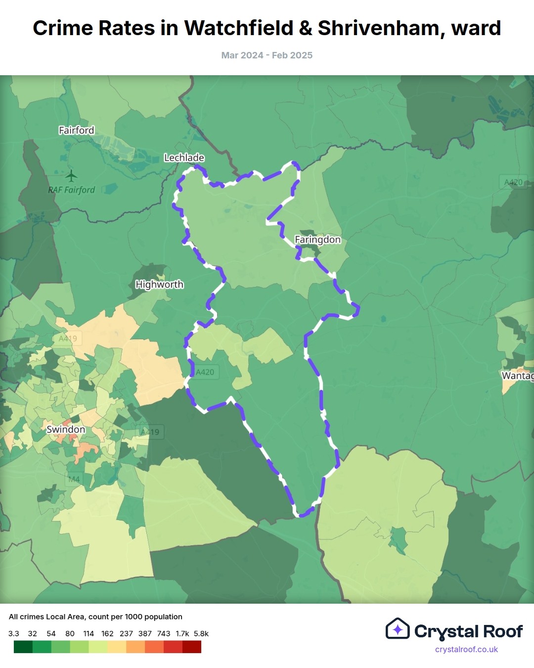 The figures in grey indicate the relative ratings of Watchfield & Shrivenham (ward) for a specific crime type compared to other wards in England and Wales.