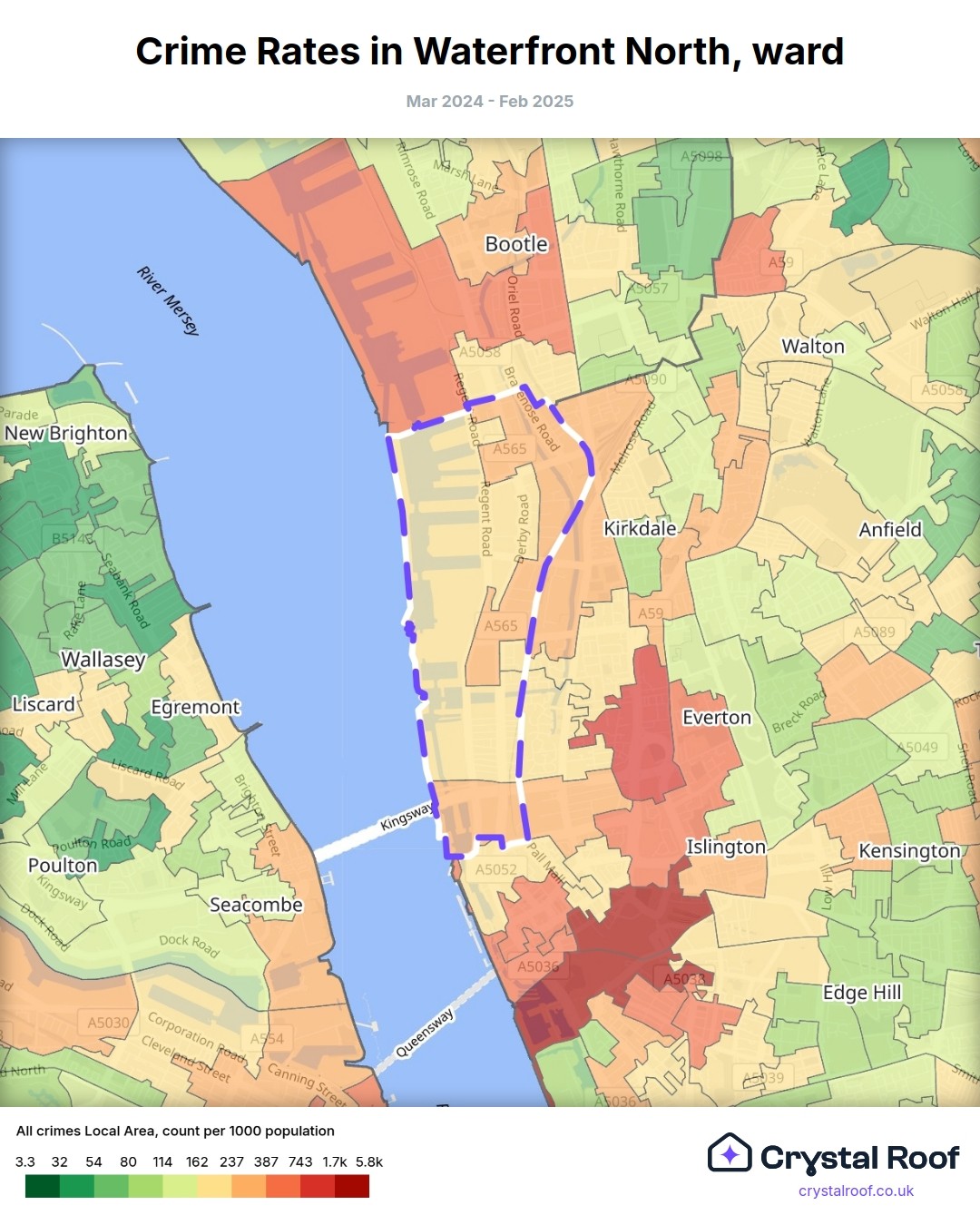 Waterfront North (ward) is located within Liverpool (borough). Annual total crime rate in Liverpool (borough) is 141 crimes per thousand resident population, which can be rated as 7 out of 10 or high crime level compared to other local authority districts in England and Wales.
