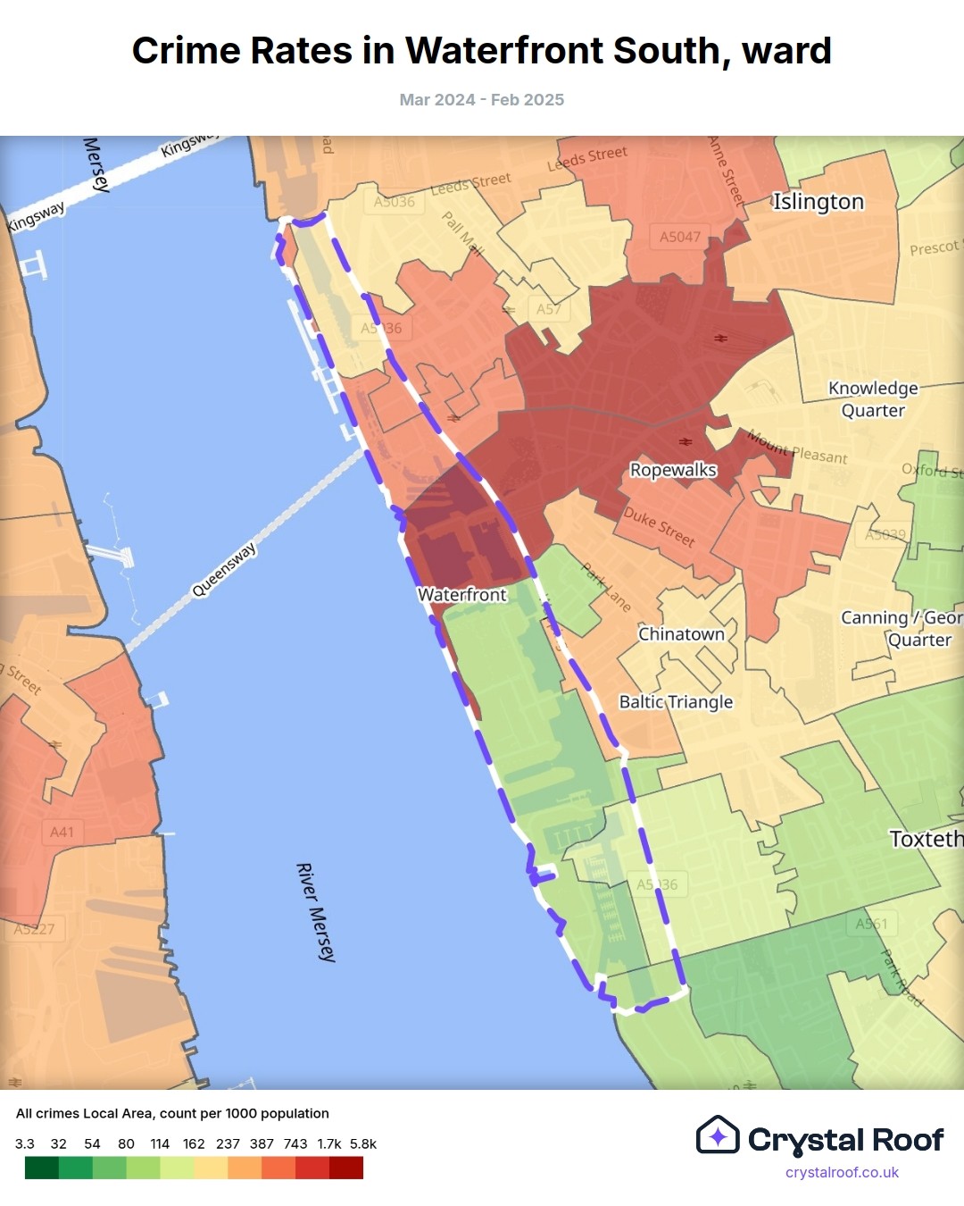 Waterfront South (ward) is located within Liverpool (borough). Annual total crime rate in Liverpool (borough) is 141 crimes per thousand resident population, which can be rated as 7 out of 10 or high crime level compared to other local authority districts in England and Wales.