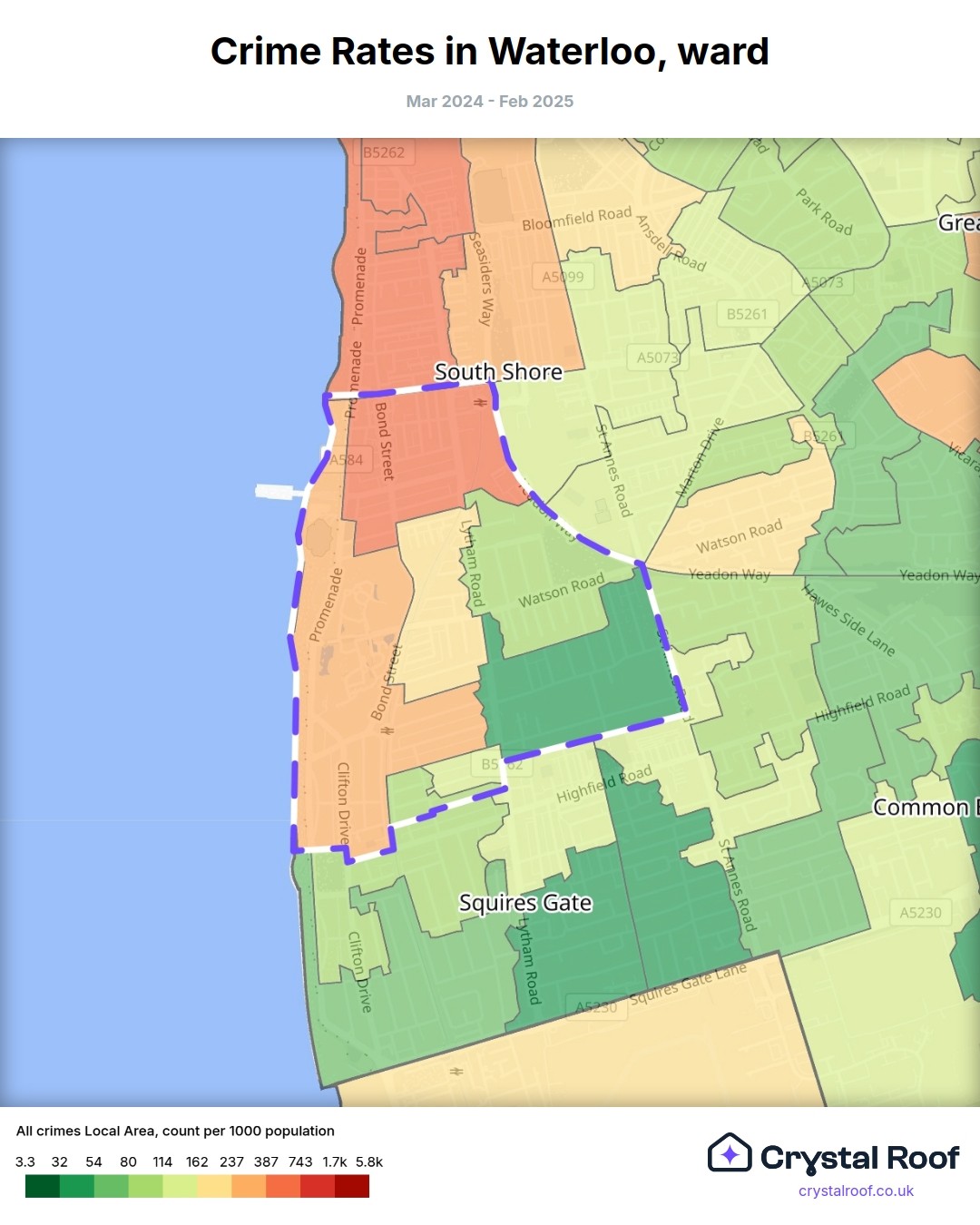 Waterloo (ward) is located within Blackpool (borough). Annual total crime rate in Blackpool (borough) is 216 crimes per thousand resident population, which can be rated as 8 out of 10 or high crime level compared to other local authority districts in England and Wales.