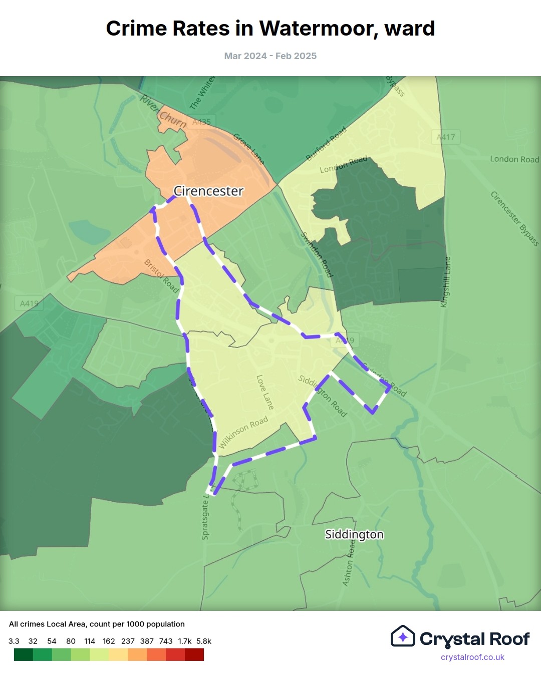 Watermoor, (ward) includes areas with the following crime ratings (see map):