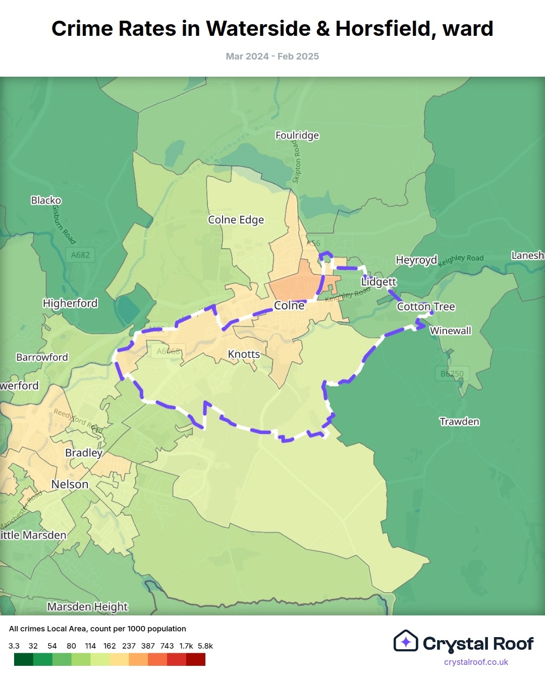 The figures in grey indicate the relative ratings of Waterside & Horsfield (ward) for a specific crime type compared to other wards in England and Wales.