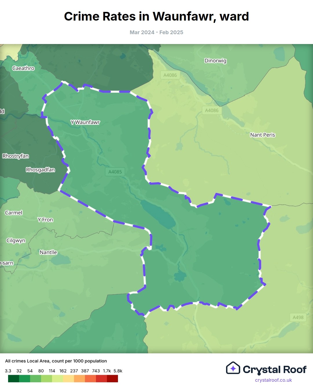 Waunfawr, (ward) includes areas with the following crime ratings (see map):