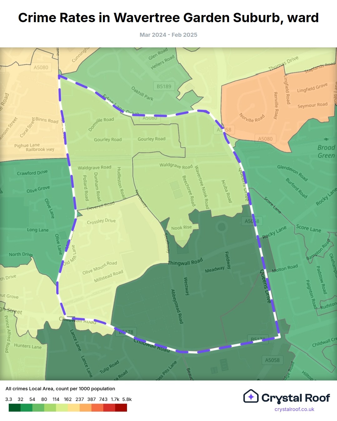 Wavertree Garden Suburb, (ward) includes areas with the following crime ratings (see map):