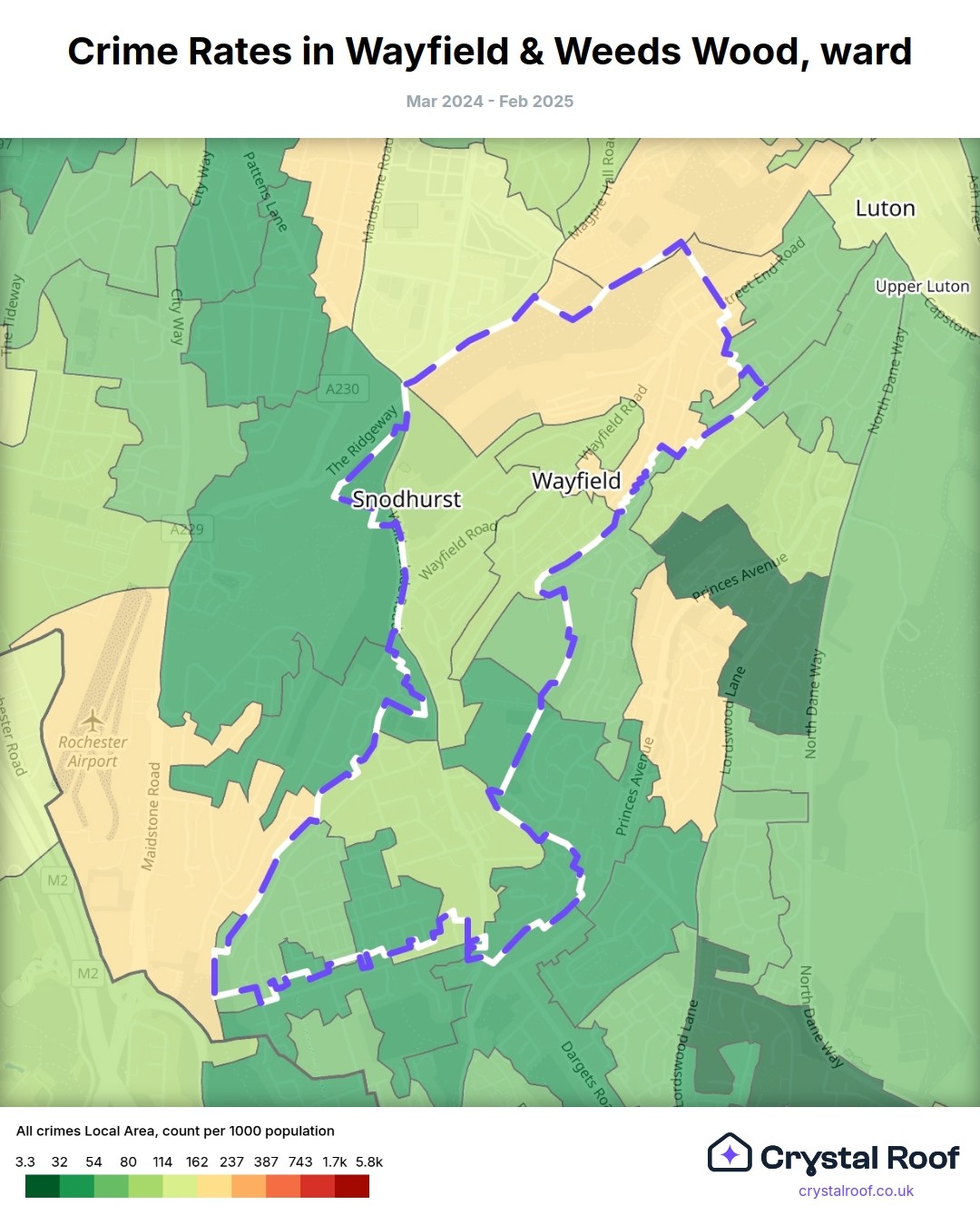 Wayfield & Weeds Wood, (ward) includes areas with the following crime ratings (see map):