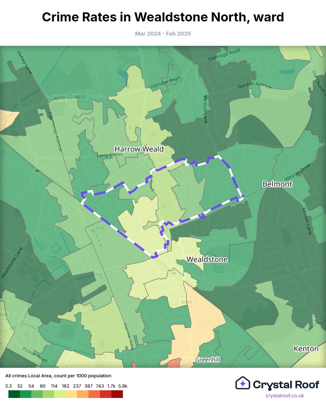The figures in grey indicate the relative ratings of Wealdstone North (ward) for a specific crime type compared to other wards in England and Wales.