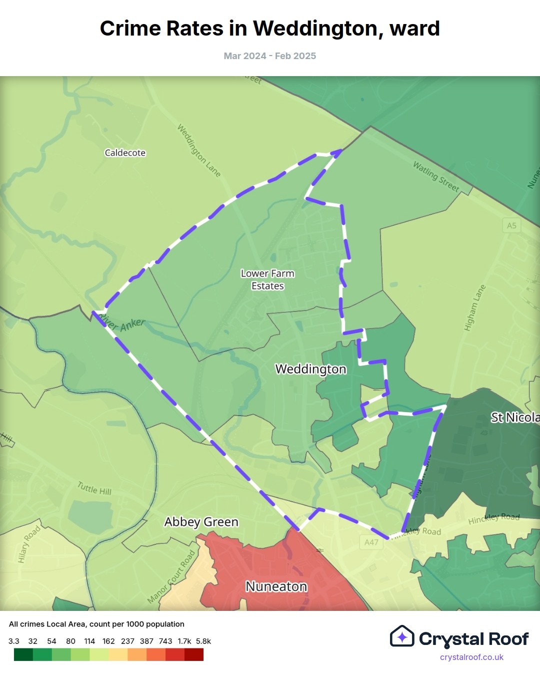 Weddington (ward) is located within Nuneaton and Bedworth (borough). Annual total crime rate in Nuneaton and Bedworth (borough) is 110 crimes per thousand resident population, which can be rated as 5 out of 10 or medium crime level compared to other local authority districts in England and Wales.