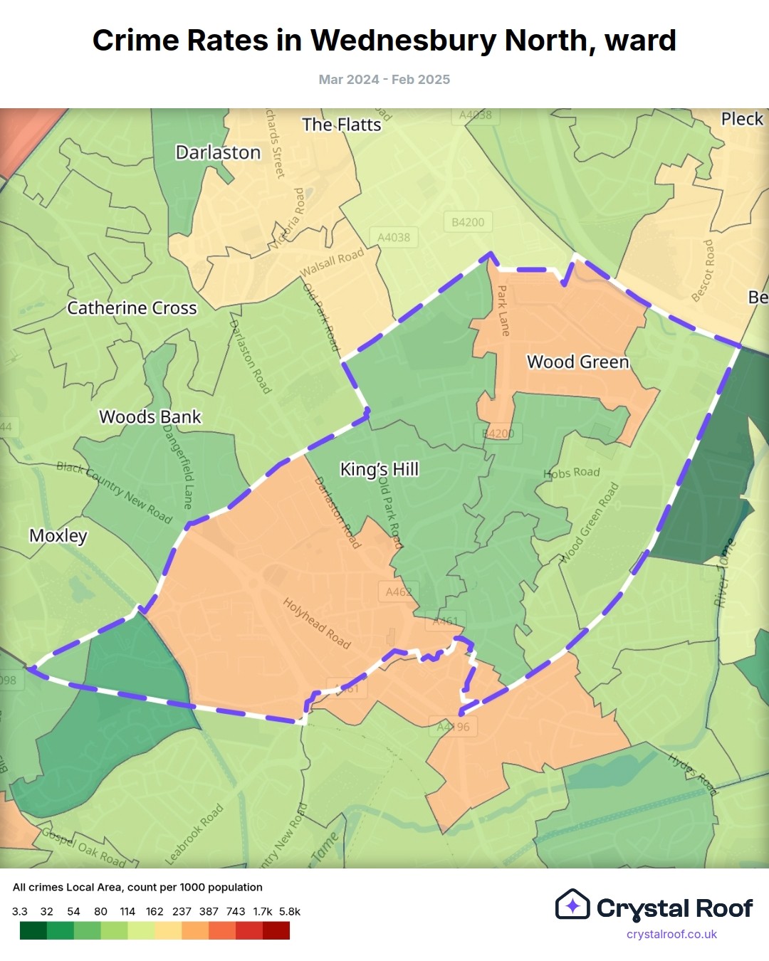 Wednesbury North, (ward) includes areas with the following crime ratings (see map):