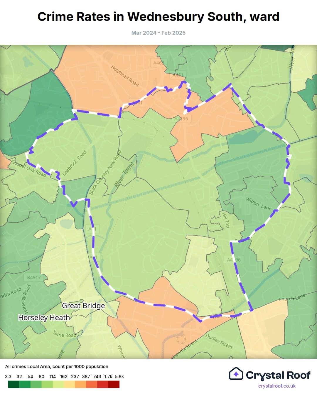 Wednesbury South, (ward) includes areas with the following crime ratings (see map):