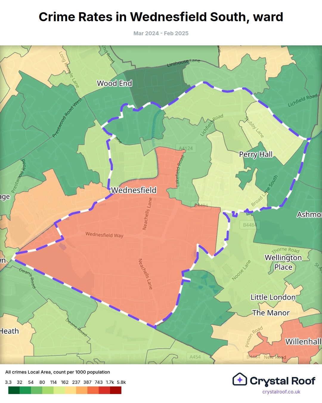 The figures in grey indicate the relative ratings of Wednesfield South (ward) for a specific crime type compared to other wards in England and Wales.