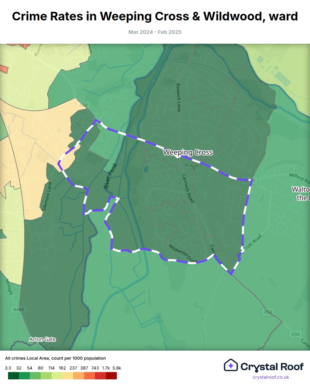 Weeping Cross & Wildwood, (ward) includes areas with the following crime ratings (see map):
