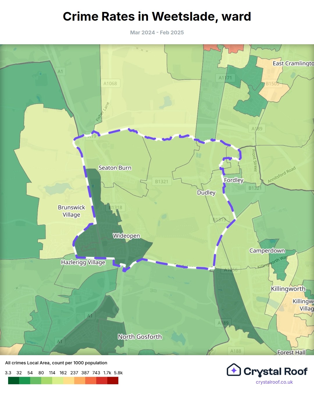 The figures in grey indicate the relative ratings of Weetslade (ward) for a specific crime type compared to other wards in England and Wales.