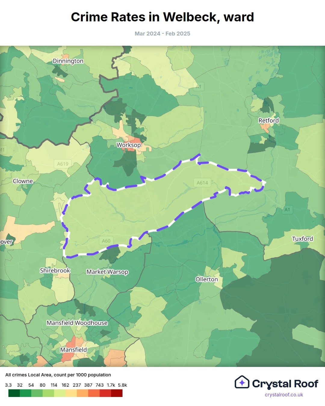 Welbeck, (ward) includes areas with the following crime ratings (see map):