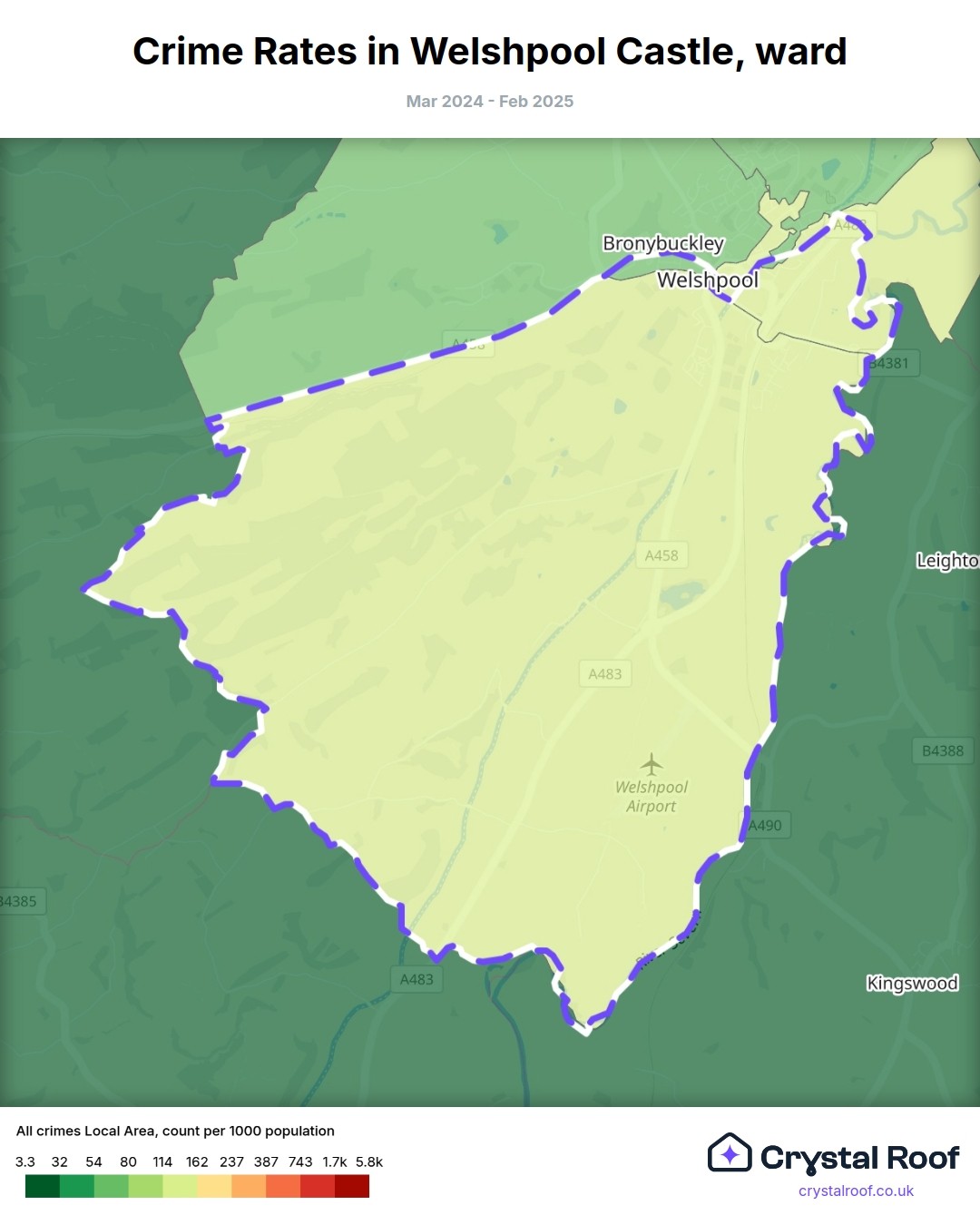 Welshpool Castle, (ward) includes areas with the following crime ratings (see map):