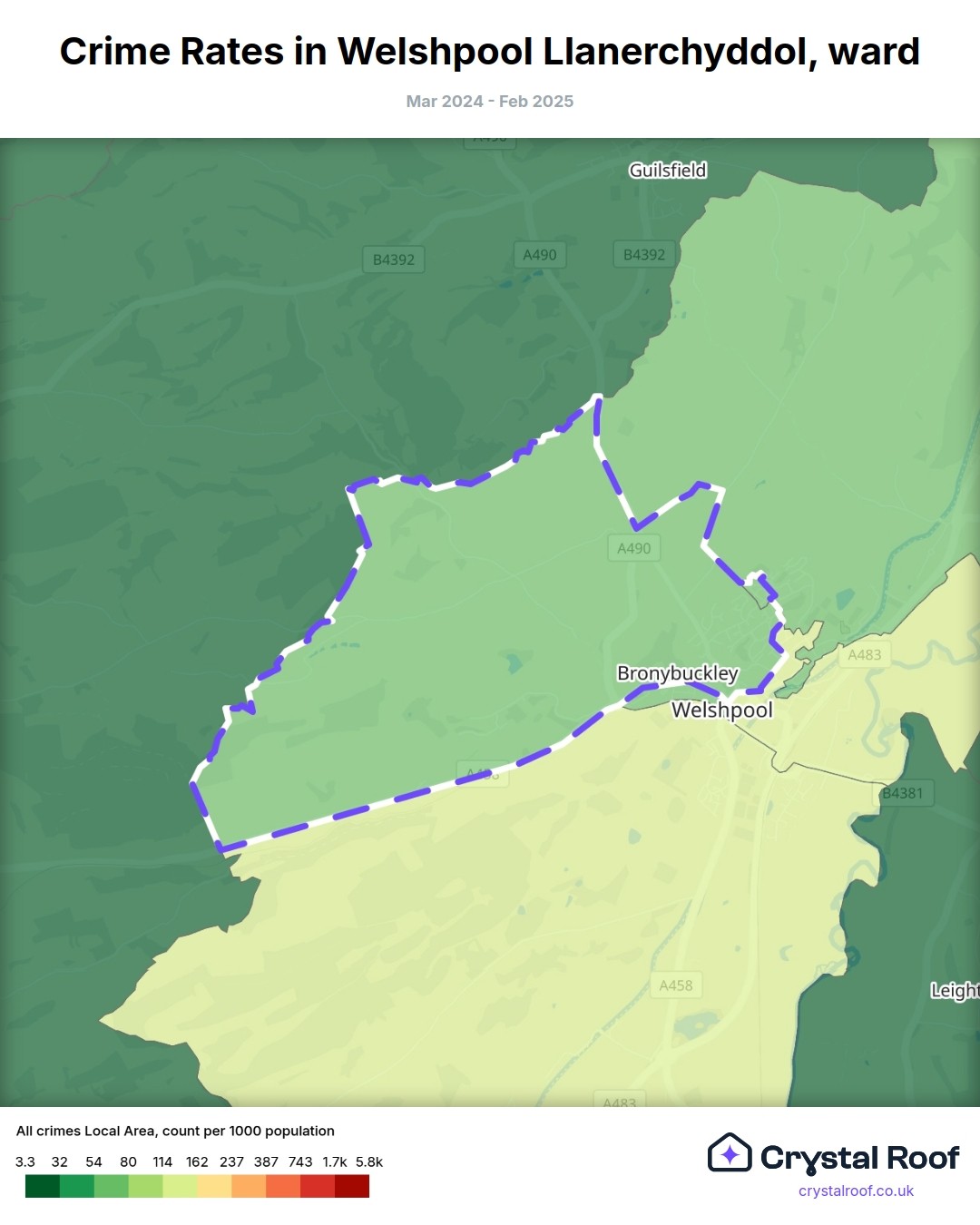 Welshpool Llanerchyddol, (ward) includes areas with the following crime ratings (see map):