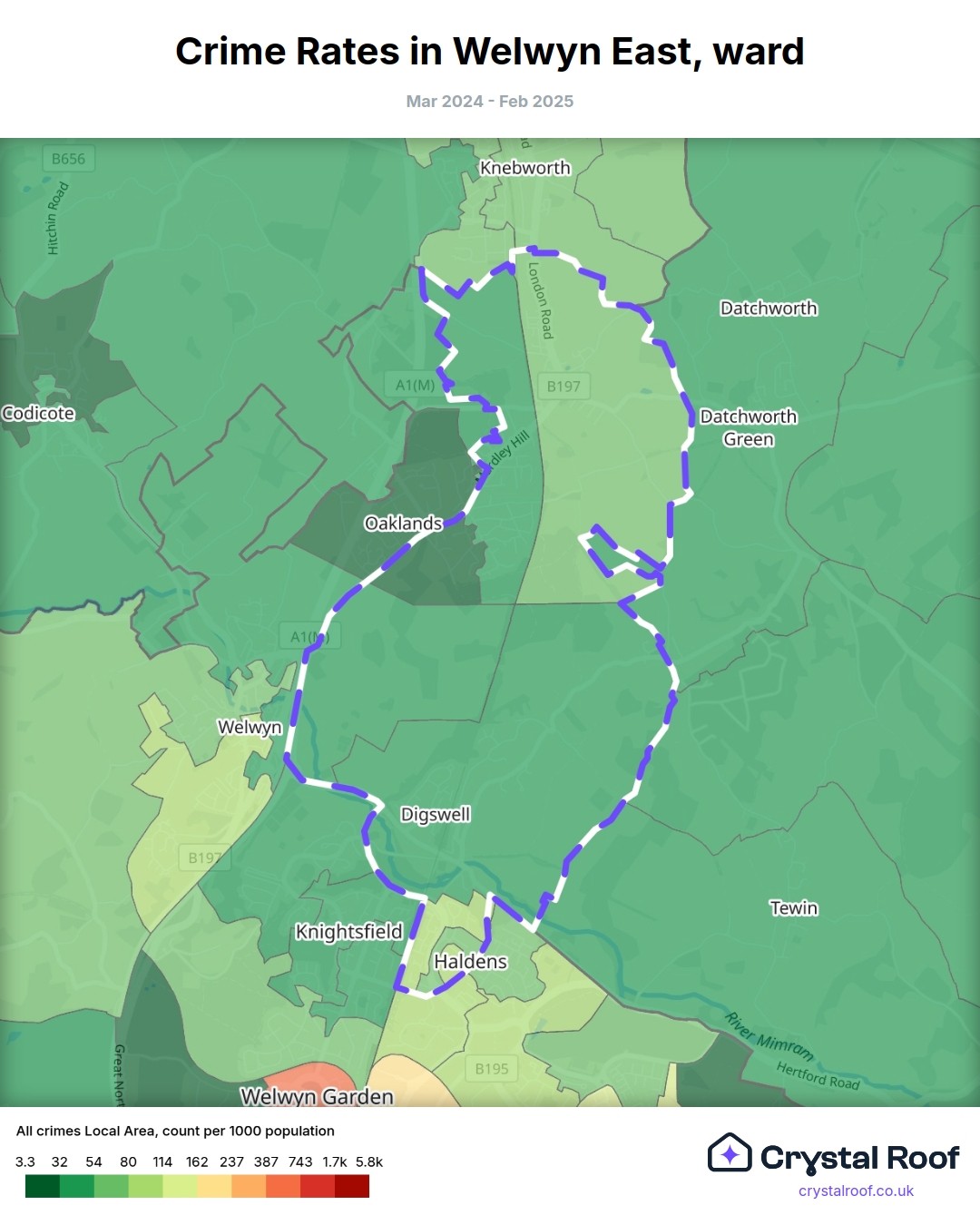 Welwyn East, (ward) includes areas with the following crime ratings (see map):