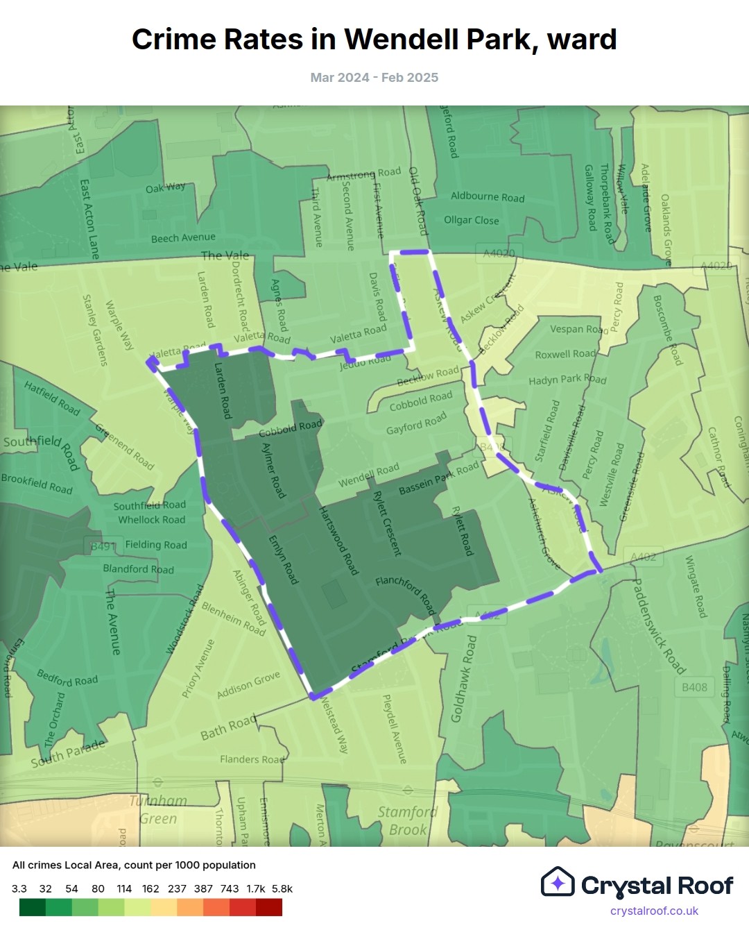Wendell Park (ward) is located within Hammersmith and Fulham (borough). Annual total crime rate in Hammersmith and Fulham (borough) is 147 crimes per thousand resident population, which can be rated as 7 out of 10 or high crime level compared to other local authority districts in England and Wales.