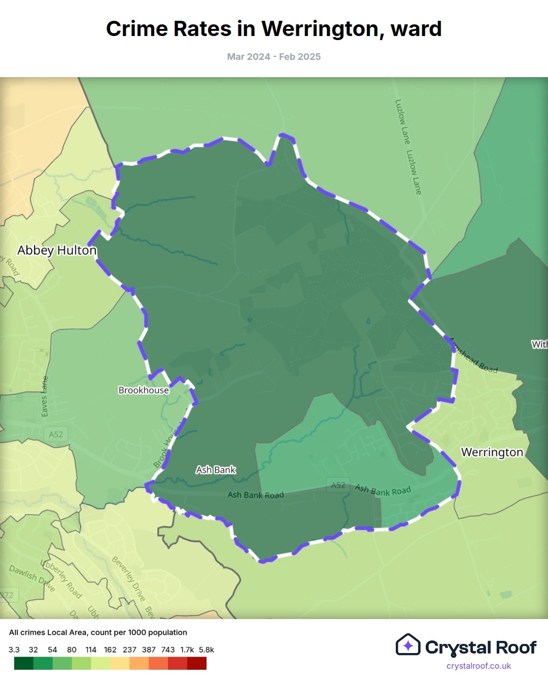 Werrington (ward) is located within Staffordshire Moorlands (borough). Annual total crime rate in Staffordshire Moorlands (borough) is 67.1 crimes per thousand resident population, which can be rated as 2 out of 10 or low crime level compared to other local authority districts in England and Wales.