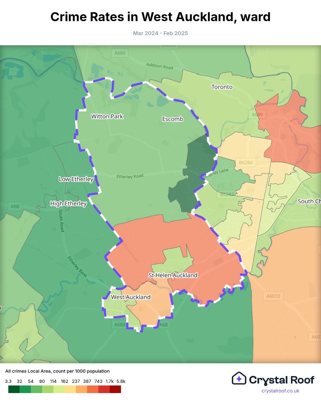 The figures in grey indicate the relative ratings of West Auckland (ward) for a specific crime type compared to other wards in England and Wales.