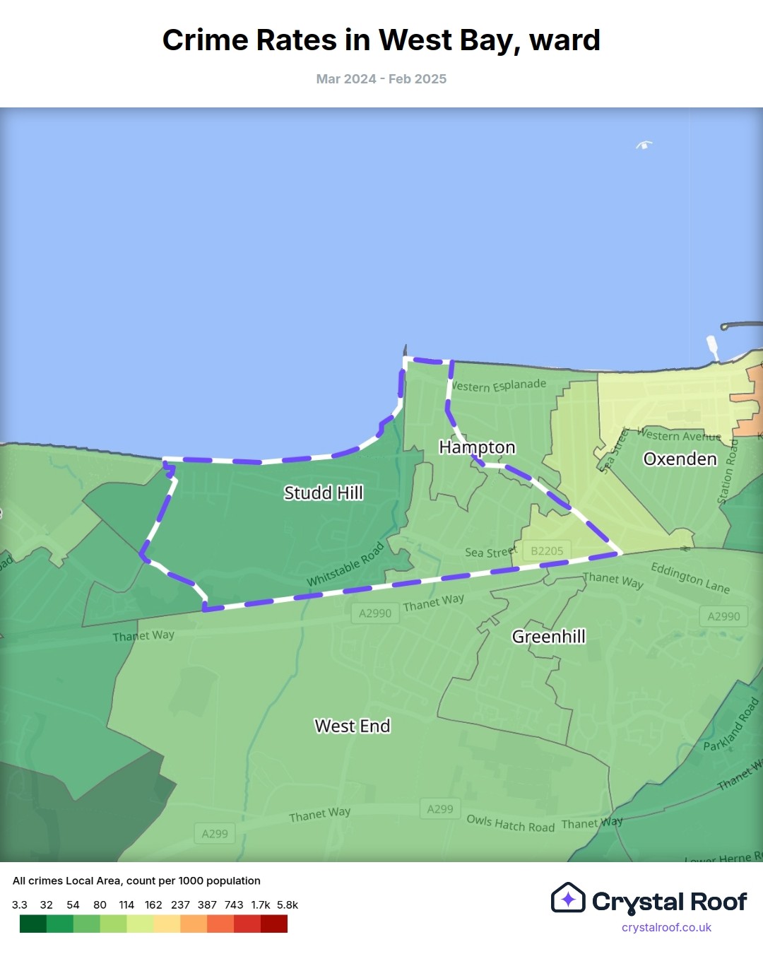 West Bay (ward) is located within Canterbury (borough). Annual total crime rate in Canterbury (borough) is 108 crimes per thousand resident population, which can be rated as 5 out of 10 or medium crime level compared to other local authority districts in England and Wales.