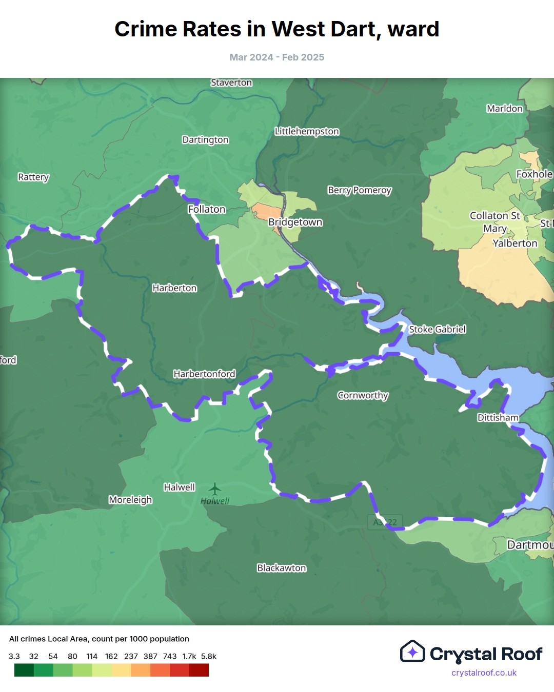 The figures in grey indicate the relative ratings of West Dart (ward) for a specific crime type compared to other wards in England and Wales.