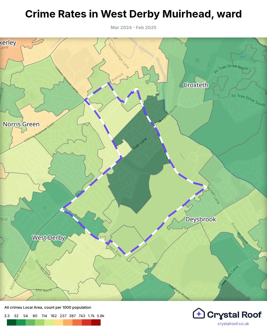 West Derby Muirhead, (ward) includes areas with the following crime ratings (see map):