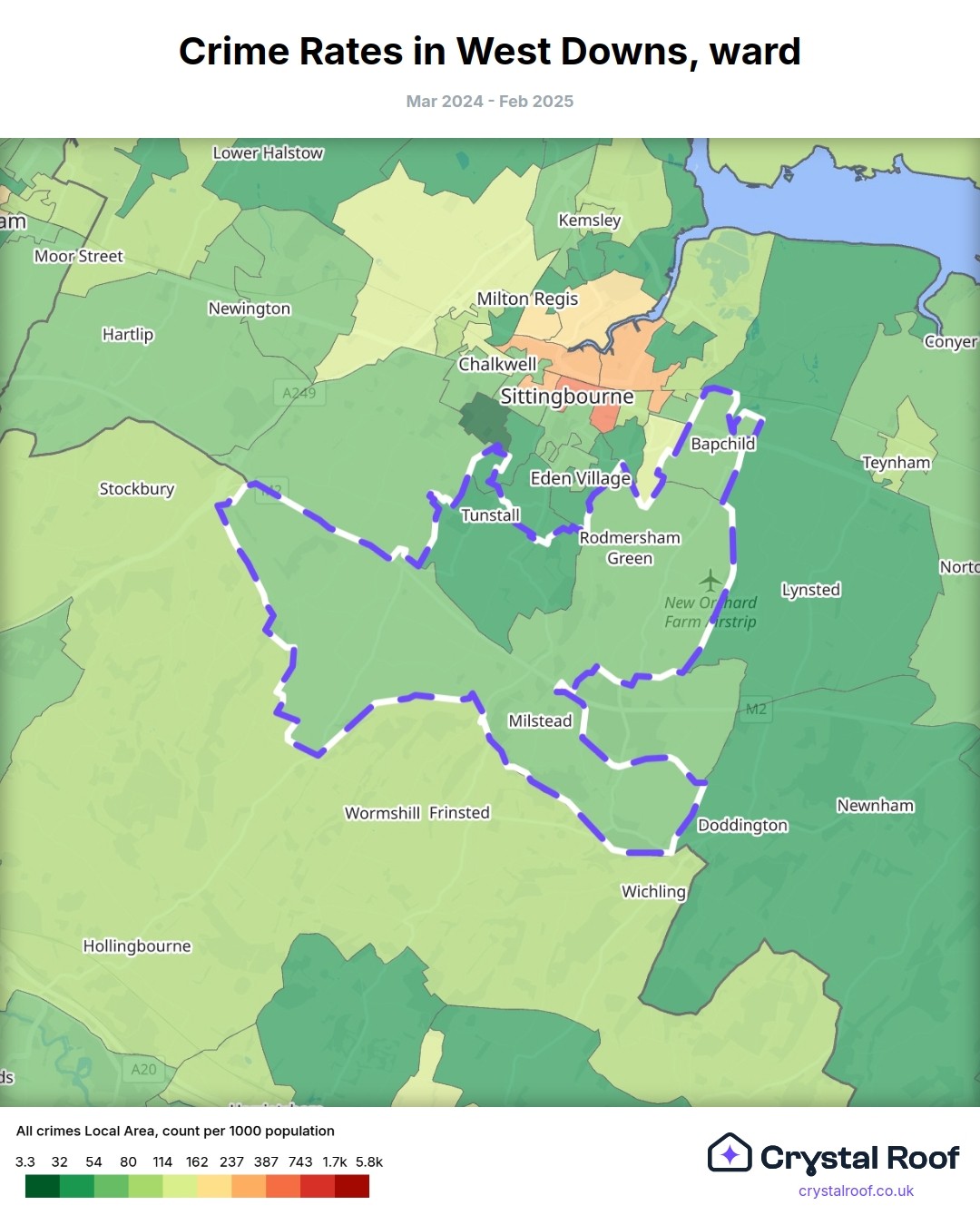 West Downs (ward) is located within Swale (borough). Annual total crime rate in Swale (borough) is 109 crimes per thousand resident population, which can be rated as 5 out of 10 or medium crime level compared to other local authority districts in England and Wales.