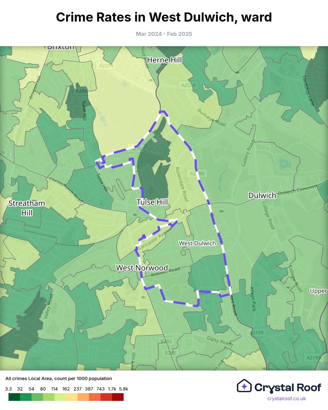 West Dulwich, (ward) includes areas with the following crime ratings (see map):
