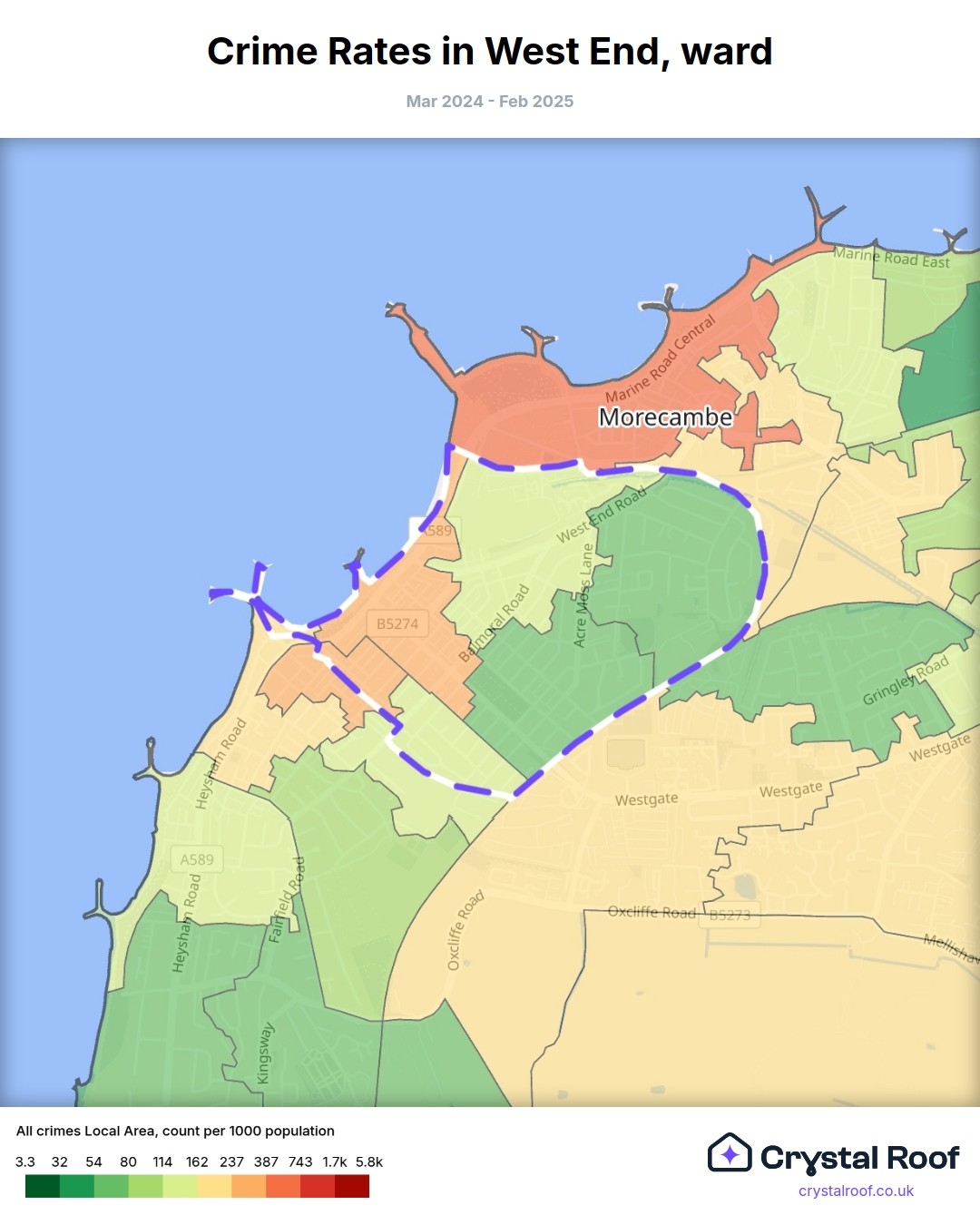 West End (ward) is located within Lancaster (borough). Annual total crime rate in Lancaster (borough) is 109 crimes per thousand resident population, which can be rated as 5 out of 10 or medium crime level compared to other local authority districts in England and Wales.