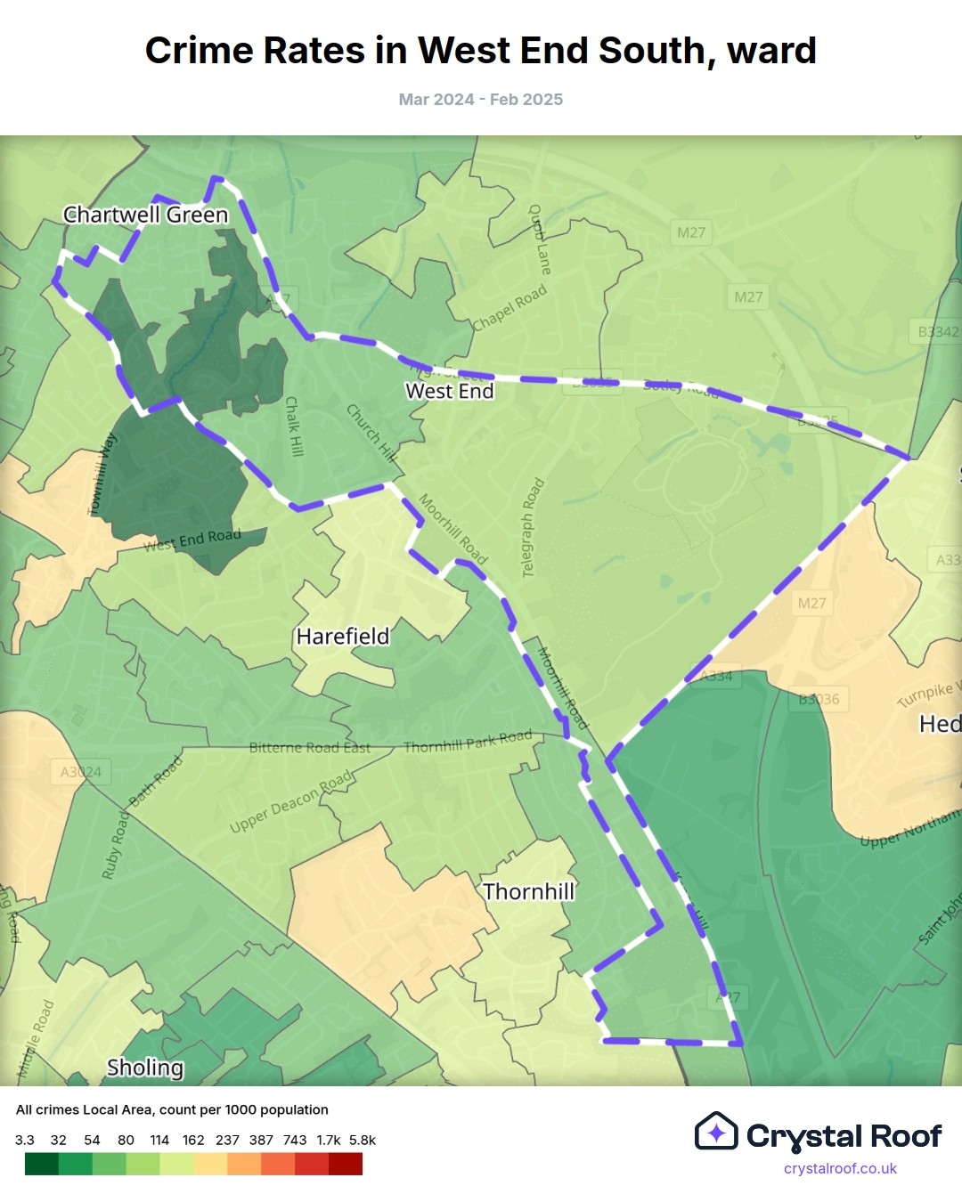 The figures in grey indicate the relative ratings of West End South (ward) for a specific crime type compared to other wards in England and Wales.